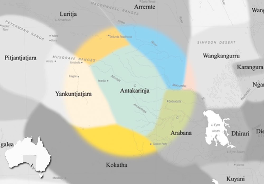 Antikirinya is a part of the Western Desert language group. The Western Desert encompasses a large expanse of land in the centre of the country, and traverses the state borders of Western Australia, South Australia, and the Northern Territory. Antikirinya has traditionally been associated with the north of South Australia. Today, Antikirinya people live in many places across South Australia, including Coober Pedy and Oodnadatta. Many people who formerly identified as Antikirinya now identify as Yankunytjatjara.